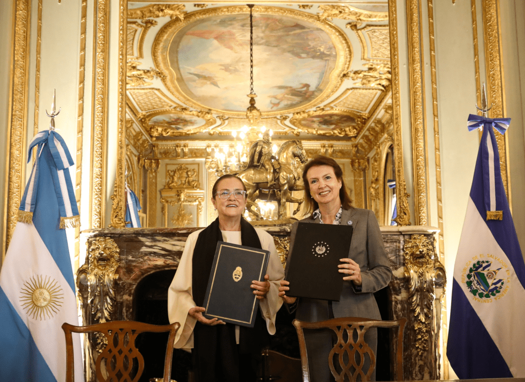 La canciller argentina, Diana Mondino, y su homóloga salvadoreña, Alexandra Hill Tinoco, suscribieron convenios en materia cultural, aeroportuaria y de capacitación para el personal diplomático. Además, se firmaron documentos de cooperación en materia de deportes y de intercambio de conservación patrimonial de archivos.