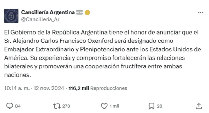 «El Gobierno de la República Argentina tiene el honor de anunciar que el Sr. Alejandro Carlos Francisco Oxenford será designado como Embajador Extraordinario y Plenipotenciario ante los Estados Unidos de América«, indicó Cancillería desde las redes sociales.