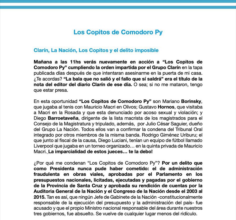 A horas de que se conozca el fallo de la Cámara de Casación, Cristina Fernández de Kirchner publicó una carta en su cuenta de X en la que sostiene que este miércoles se verá “nuevamente en acción a ‘Los Copitos de Comodoro Py’”.