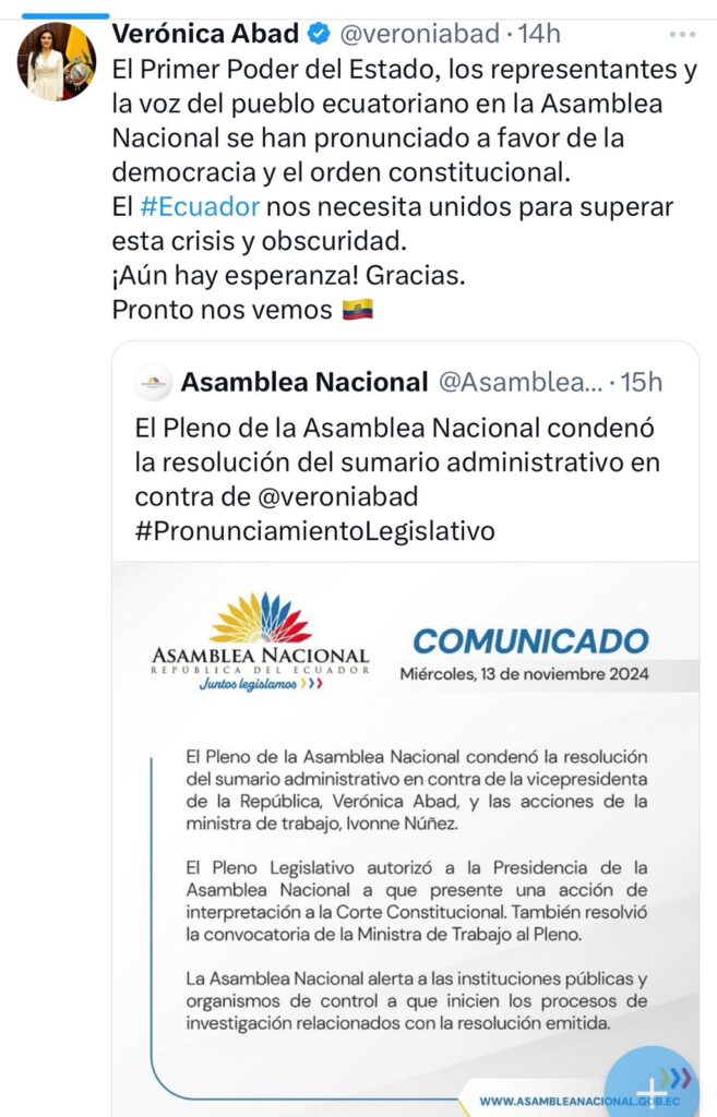 Horas después de la aparición de la vicepresidenta del país, Verónica Abad, en el pleno parlamentario, la Asamblea Nacional ecuatoriana decidió rechazar la suspensión de funciones contra la vicepresidenta, impuesta por el Ministerio de Trabajo liderado por Núñez.