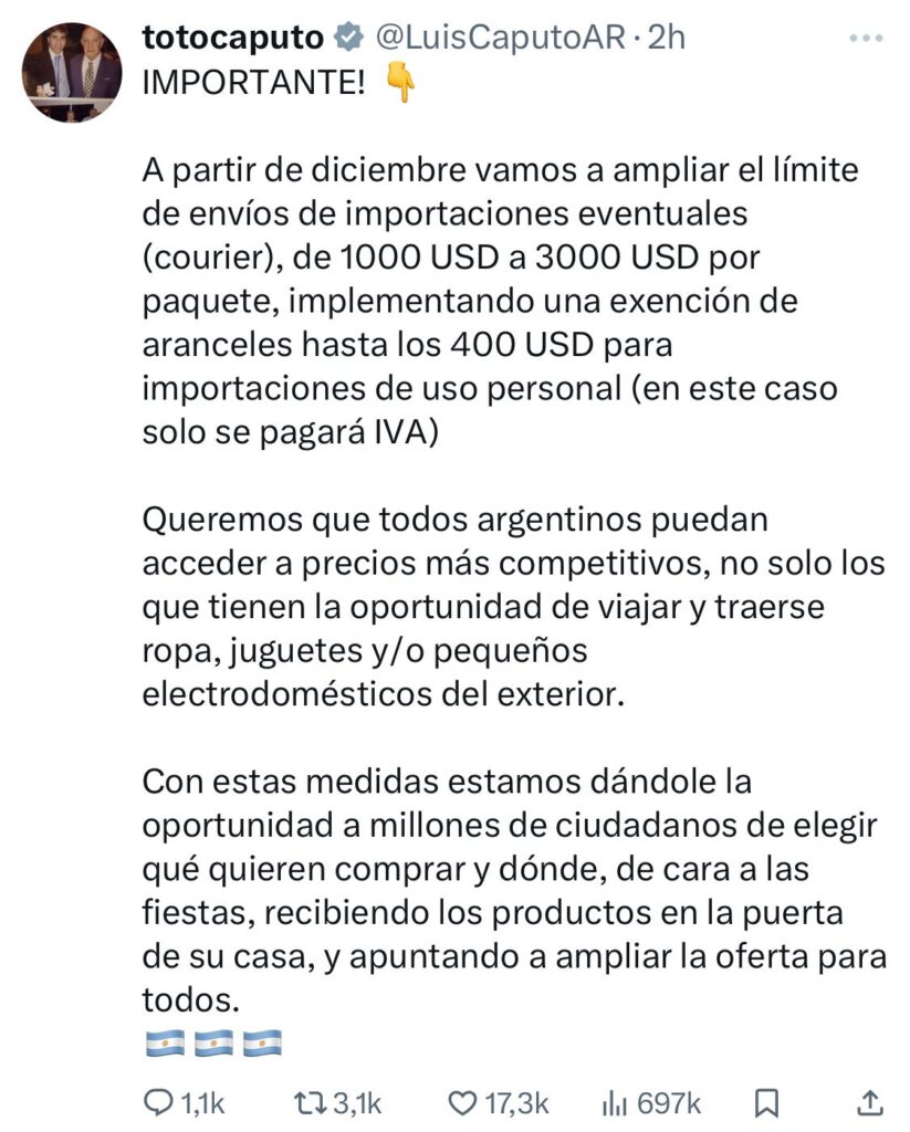 Por su parte, el ministro de Economía Luis Caputo anunció que “a partir de diciembre van a ampliar ”el límite de envíos de importaciones eventuales (courier), de US$1000 a US$3000 por paquete, implementando una exención de aranceles hasta los US$400 para importaciones de uso personal (en este caso solo se pagará IVA)”.