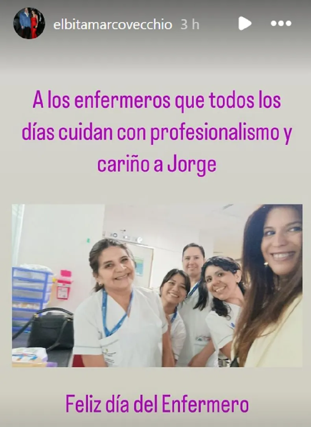 «A los enfermeros que todos los días cuidan con profesionalismo y cariño a Jorge, feliz día del enfermero«, dice la publicación de Elba, junto a una selfie con cuatro integrantes del cuerpo médico que se encarga de la salud del periodista.