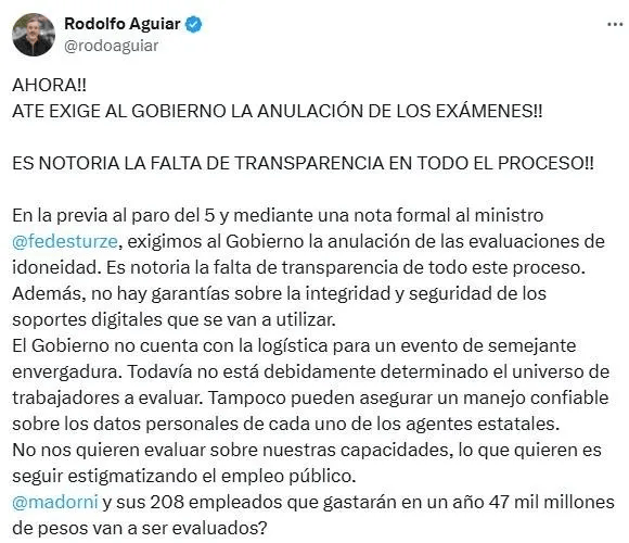 En este marco, alertó que “con los antecedentes de ataque, persecución y asedio hacia los estatales” estos exámenes están destinados «a perjudicar a los trabajadores«. «¿(Manuel) Adorni y sus 208 empleados que gastarán en un año 47 mil millones de pesos, van a ser evaluados?«, cuestionó.