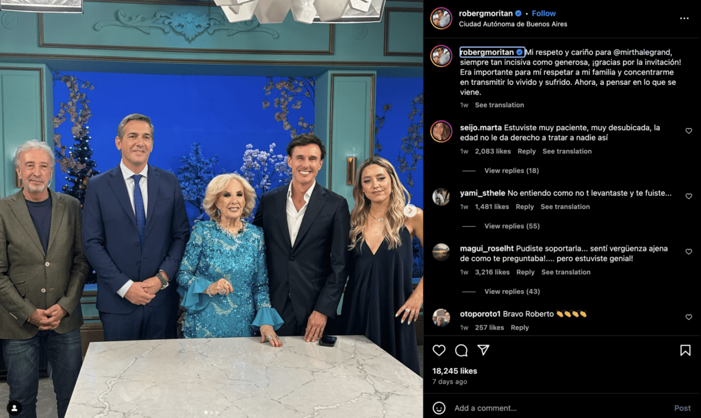 A pesar del entredicho, de la insistencia de la conductora en preguntarle por los detalles de su separación y de las fuertes frases que Mirtha disparó el sábado pasado -”a nadie le importa que seas funcionario público. Importa que seas el marido de Pampita”, disparó-, el exfuncionario público de la Ciudad de Buenos Aires publicó en su perfil de Instagram un descargo en relación con lo sucedido. “Mi respeto y cariño para Mirtha Legrand, siempre tan incisiva como generosa, ¡gracias por la invitación! Era importante para mí respetar a mi familia y concentrarme en transmitir lo vivido y sufrido”, escribió junto a varias fotos de su participación en La noche de Mirtha.
