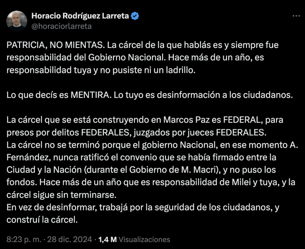 «Lo tuyo es desinformación a los ciudadanos. La cárcel que se está construyendo en Marcos Paz es FEDERAL, para presos por delitos FEDERALES, juzgados por jueces FEDERALES» sostuvo Larreta.