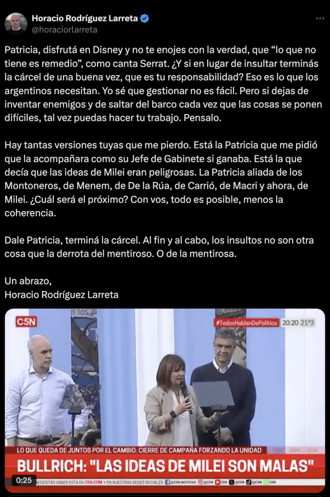 Larreta respondió a este mensaje: «¿Y si en lugar de insultar terminás la cárcel de una buena vez, que es tu responsabilidad? Eso es lo que los argentinos necesitan» dijo y agregó «Hay tantas versiones tuyas que me pierdo». Posteriormente enlisto todas las alianzas que ha hecho la ministra: «Montoneros, de Menem, de De la Rúa, de Carrió, de Macri y ahora, de Milei«.