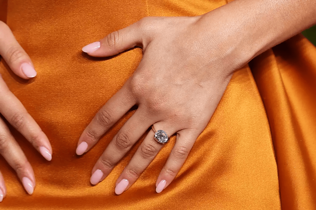 Sin embargo, un segundo anillo que Zendaya lleva en su mano izquierda era más llamativo: el anillo parece ser un anillo con diamantes de talla cojín de 5,02 ct engastados en una banda de oro blanco y amarillo de 18 quilates. El aparente diseño del anillo aparece en la sección de anillos de compromiso del sitio web de la marca y muestra un diamante de talla cojín de 5,02 ct engastado en una banda de oro blanco y amarillo de 18 quilates.