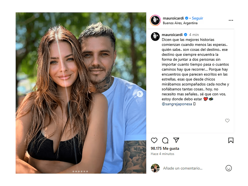 “Dicen que las mejores historias comienzan cuando menos las esperas… quién sabe… son cosas del destino», escribió Mauro Icardi para blanquear el romance con Eugenia. Un tono romántico, del que no se corrió en el texto y sobre el que promete transcurrir la relación: “Ese destino que siempre encuentra la forma de juntar a dos personas sin importar cuánto tiempo pase o cuántos caminos hay que recorrer”.