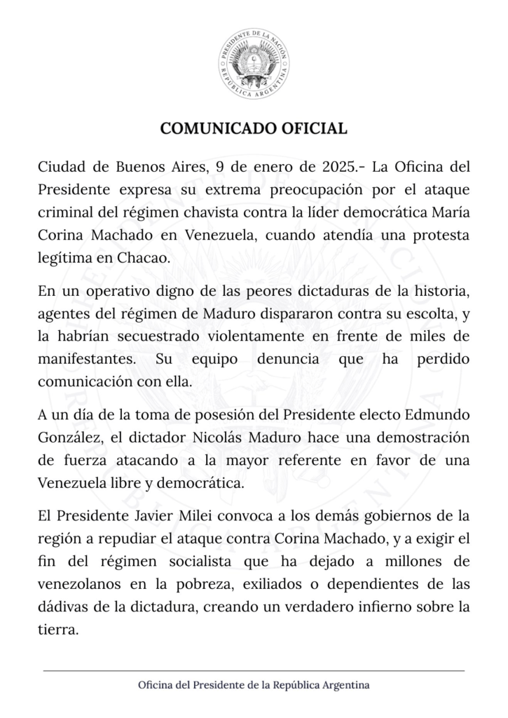 «El presidente Javier Milei convoca a los demás gobiernos de la región a repudiar el ataque contra Corina Machado, y a exigir el fin del régimen socialista que ha dejado a millones de venezolanos en la pobreza, exiliados o dependientes de las dádivas de la dictadura, creando un verdadero infierno sobre la tierra», finalizó.