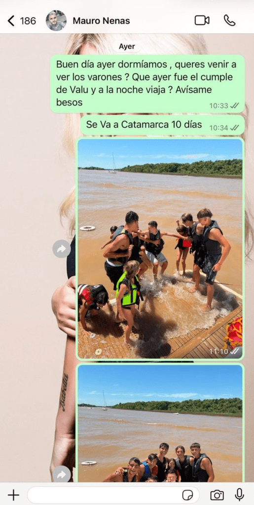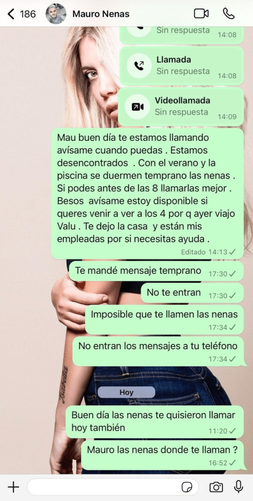 Horas después y, al no recibir respuesta, Nara volvió a insistir: “Te mandé mensaje temprano. No te entran. Imposible que te llamen las nenas. No entran los mensajes a tu teléfono”. Y, al día siguiente, lo mismo: “Buen día las nenas te quisieron llamar hoy también. ¿Mauro las nenas donde te llaman?”.