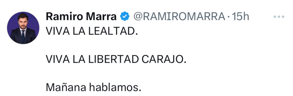 Después del anuncio de LLA, donde se informó Marra que ya no forma parte del espacio a nivel nacional ni en ningún distrito del país, el legislador compartió un breve mensaje en su cuenta de la red social X tras lo sucedido. «VIVA LA LEALTAD. VIVA LA LIBERTAD CARAJO. Mañana hablamos«, expresó el dirigente.