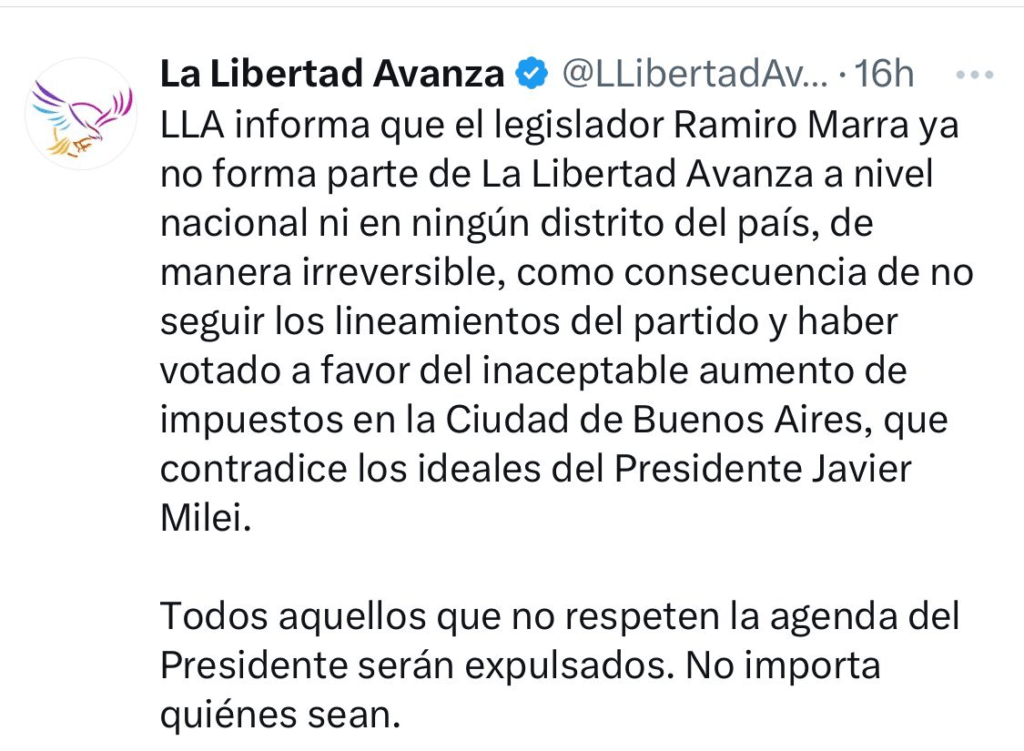 «LLA informa que el legislador Ramiro Marra ya no forma parte de La Libertad Avanza a nivel nacional ni en ningún distrito del país, de manera irreversible, como consecuencia de no seguir los lineamientos del partido y haber votado a favor del inaceptable aumento de impuestos en la Ciudad de Buenos Aires, que contradice los ideales del Presidente Javier Milei. Todos aquellos que no respeten la agenda del Presidente serán expulsados. No importa quiénes sean», resalta el comunicado.