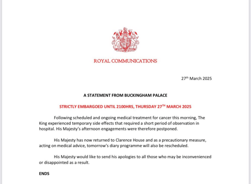 El Palacio de Buckingham informó que el rey británico, Carlos III, suspendió las actividades que tenía en su agenda para este viernes 28 de marzo, luego de que el monarca sufriera efectos secundarios del tratamiento contra el cáncer «que requirieron un breve periodo de observación en el hospital».