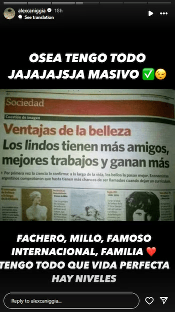 Caniggia que subió a sus redes una captura de un diario que dice: «Ventajas de la belleza. Los lindos tienen más amigos, mejores trabajos y ganan más» y sobre la imagen el conductor escribió en letras mayúsculas : «O sea, tengo todo jajaja masivo».