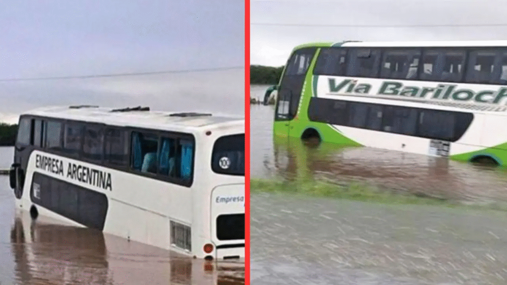Una de las docentes a bordo confirmó que los chicos están contenidos y en buen estado, aunque rodeados por agua sin referencias viales visibles: “No podemos ir para adelante ni para atrás. No vemos la ruta, sólo agua”, declaró.