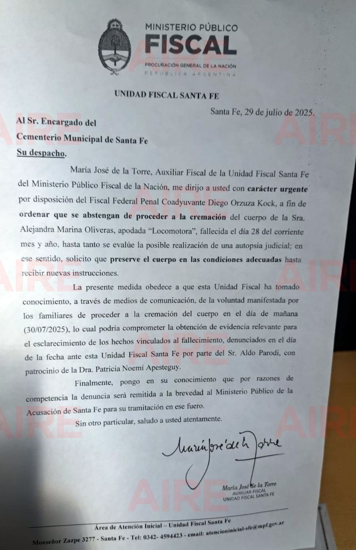 En el escrito, María José de la Torre –auxiliar fiscal de la Unidad Fiscal Santa Fe del Ministerio Público Fiscal de la Nación– se dirige a las autoridades del cementerio “con carácter urgente” por disposición del fiscal federal penal coadyuvante Diego Orzuza Cock para ordenarles “que se abstengan de proceder a la cremación del cuerpo de la Sra. Alejandra Marina Oliveras (…) hasta tanto se evalúe la posible realización de una autopsia judicial”.