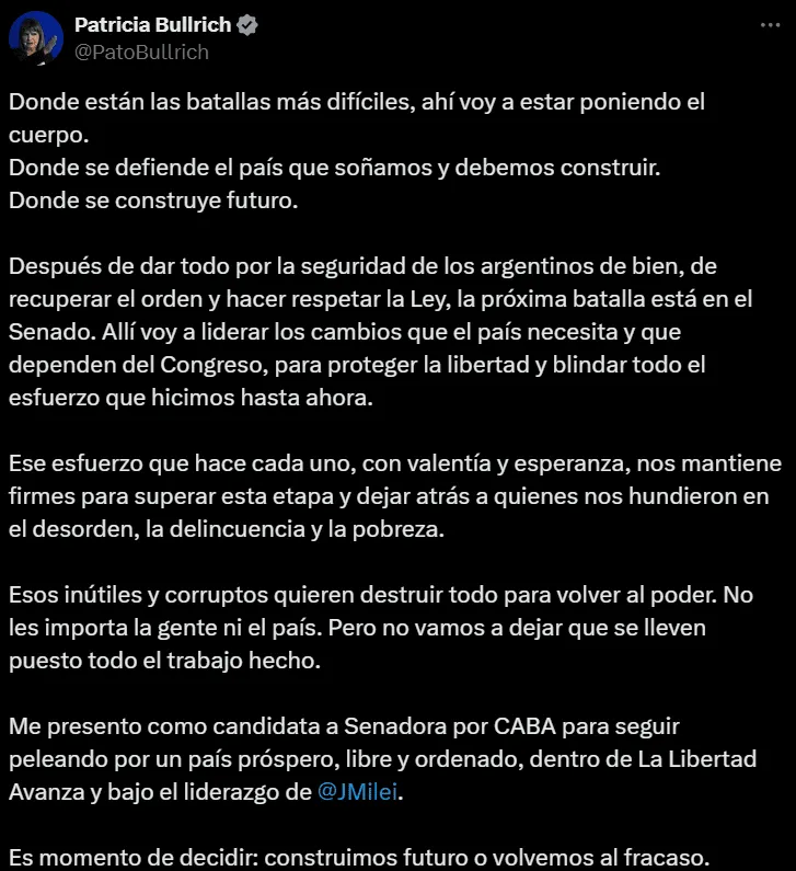 “Donde están las batallas más difíciles, ahí voy a estar poniendo el cuerpo», aseguró sobre la banca que buscará en el Senado, donde actualmente el peronismo es la primera minoría, muy cerca del quórum. «Donde se defiende el país que soñamos y debemos construir. Donde se construye futuro”, continuó Bullrich en el mensaje que posteó al respecto en su cuenta de la red social “X”.