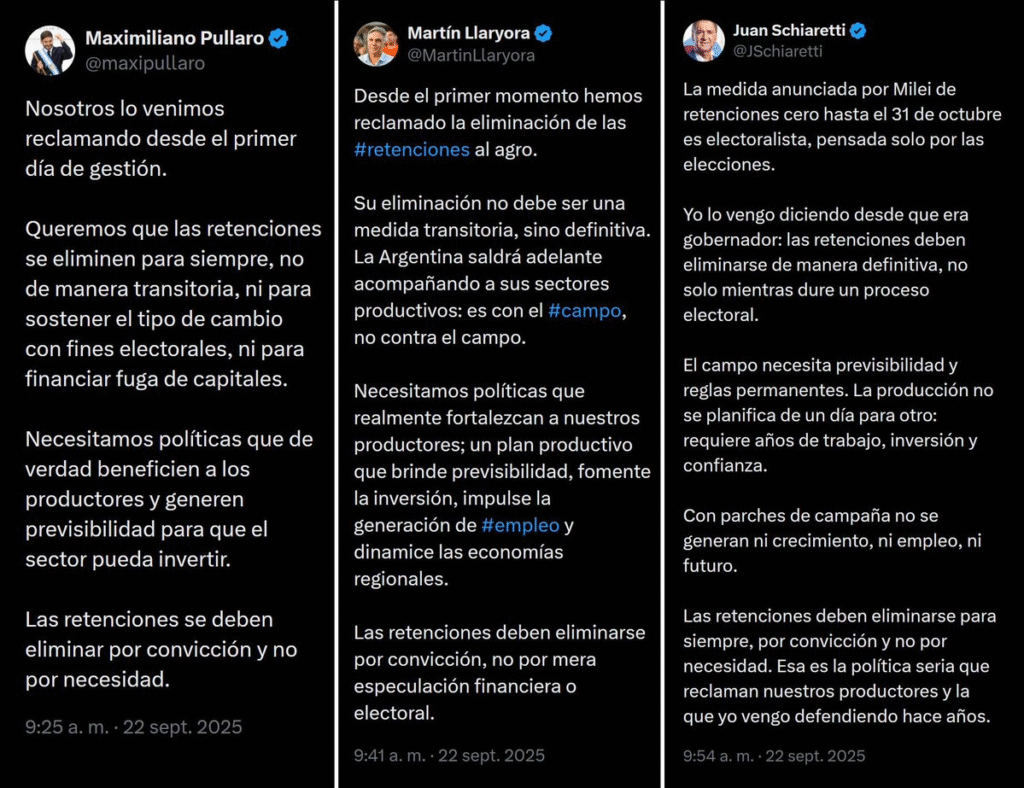 Llaryora, por su parte, se manifestó en el mismo tono sobre la medida anunciada horas atrás por el vocero presidencial, Manuel Adorni. «Desde el primer momento hemos reclamado la eliminación de las retenciones al agro. Su eliminación no deber ser una medida transitoria, sino definitiva. La Argentina saldrá adelante acompañando a sus sectores productivos: es con el campo, no contra el campo», subrayó en sus redes sociales.