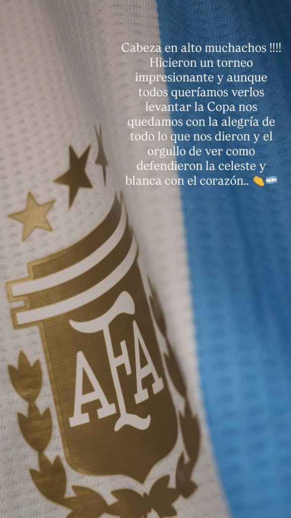 “Cabeza en alto muchachos. Hicieron un torneo impresionante y aunque todos queríamos verlos levantar la Copa, nos quedamos con la alegría de todo lo que nos dieron y el orgullo de ver cómo defendieron la celeste y blanca con el corazón”, publicó el capitán de la Selección Argentina absoluta.