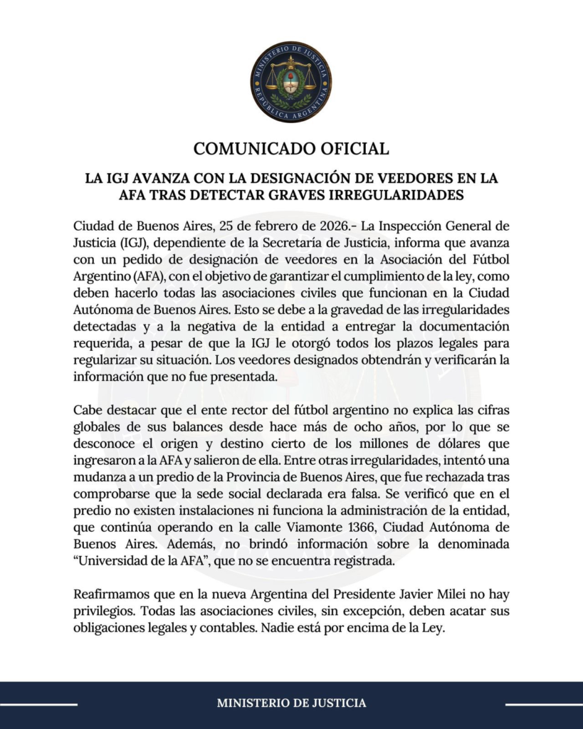 La guerra entre la Asociación del Fútbol Argentino (AFA) y la Inspección General de Justicia (IGJ) ha cruzado hoy una línea roja. El titular de la IGJ, Daniel Vítolo, solicitó oficialmente al Ministerio de Justicia la designación de veedores en la entidad de la calle Viamonte. La medida busca acceder de forma directa a la información contable y financiera de la asociación, luego de que ayer venciera el plazo para que la AFA presentara la ampliación de sus estados contables sin éxito.