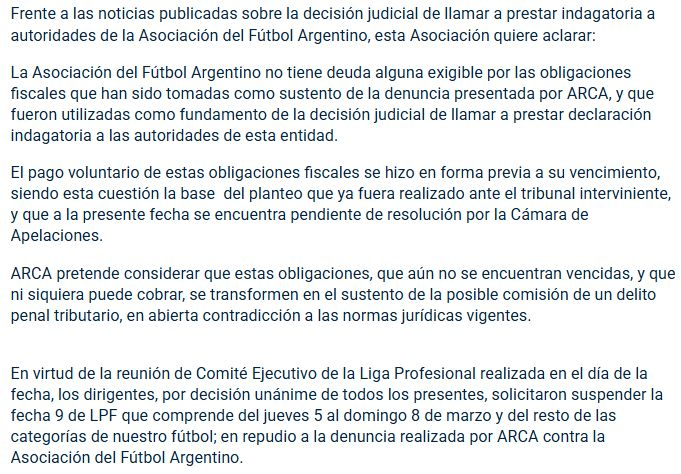 El fĂștbol argentino pararĂĄ por completo los dĂ­as 5, 6, 7 y 8 de marzo. Los clubes de Primera DivisiĂłn resolvieron convocar a un paro que abarcarĂĄ todas las categorĂ­as, repudiando a los embates del ARCA en materia tributaria contra la AsociaciĂłn del FĂștbol Argentino (AFA) y sus dirigentes.