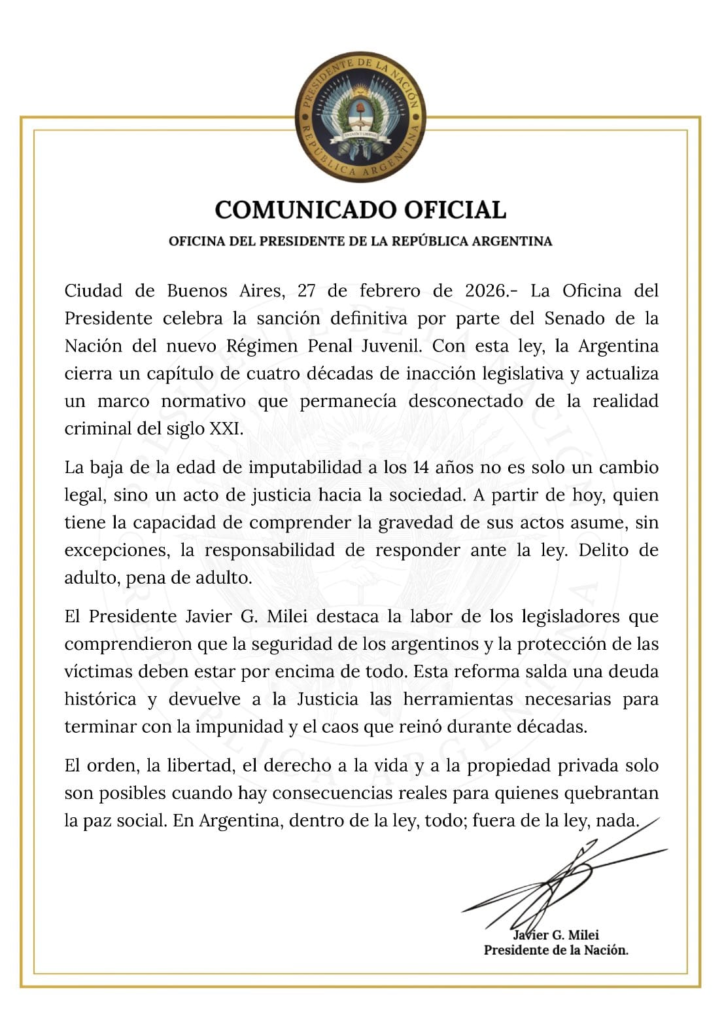 “Es ley la Reforma Penal Juvenil en Argentina: el Senado aprobó la baja de la edad de imputabilidad a 14 años. Conocé los alcances de la nueva normativa, las penas máximas para delitos graves y las medidas educativas propuestas por el Gobierno de Javier Milei.”