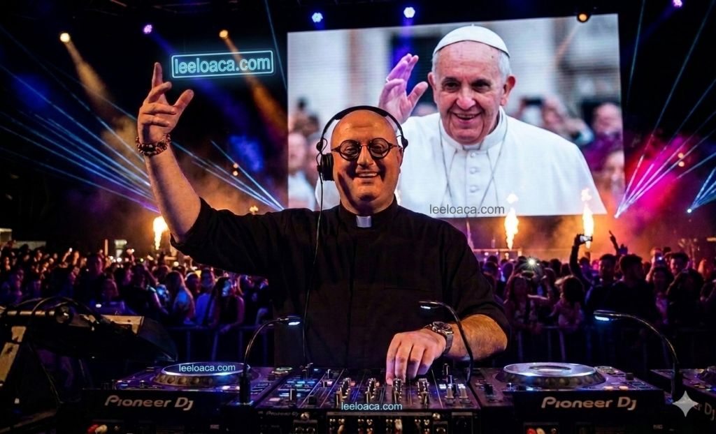 “Fe a 128 BPM: El Padre Guilherme Peixoto (el ‘Cura DJ’) transforma la Plaza de Mayo en un templo electrónico. De fondo, un mural gigante del Papa Francisco y símbolos de paz global coronaron una noche histórica de encuentro y unidad en Buenos Aires. (Foto exclusiva para leeloaca.com)”.